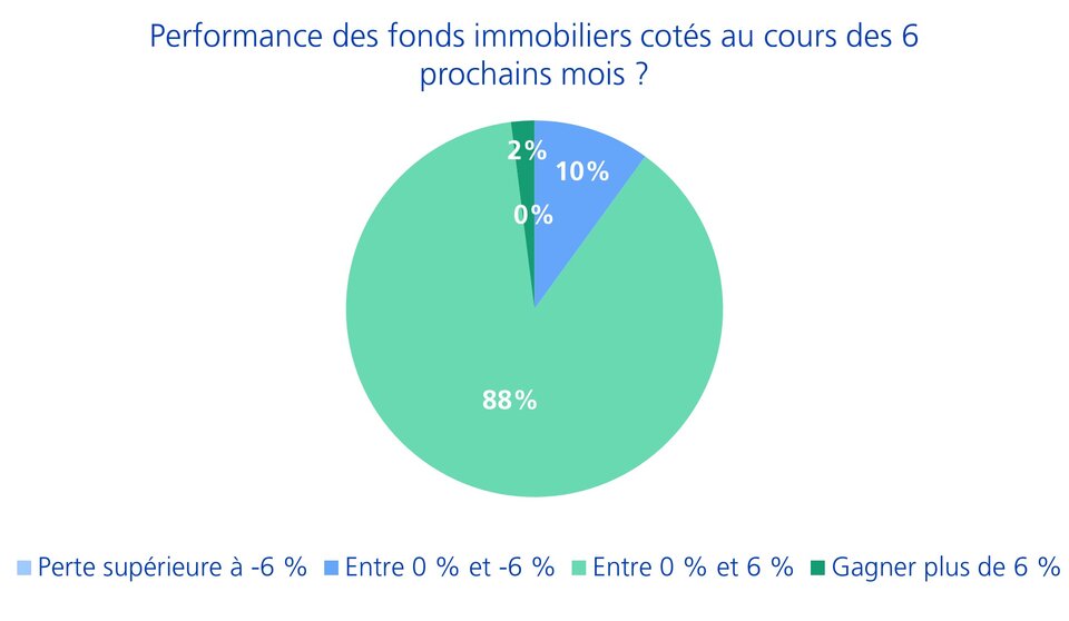 Une image similaire se dessine pour les fonds immobiliers suisses cotés (voir graphique 2) : malgré des primes élevées (plus de 35% au-dessus de la valeur nette d'inventaire, VNI), près de 90% des participants s'attendent à une performance modérée de 0 à 6%. Seuls 10% des CIO craignent une baisse des prix.